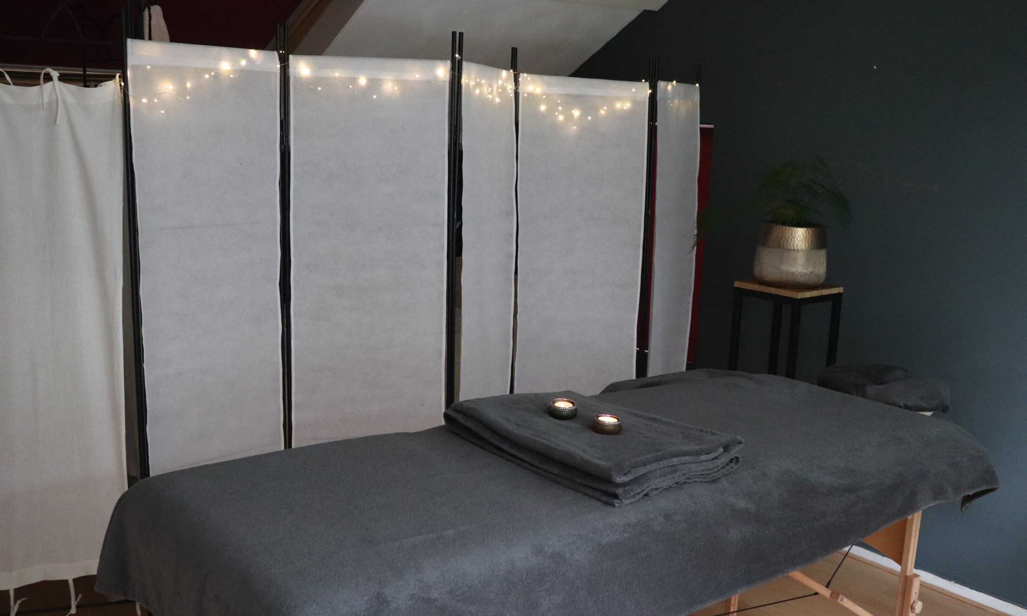 Zodra je binnenkomt, zorg ik voor een sfeer van diepe ontspanning: een aangename temperatuur, gedempt licht, kaarsverlichting en rustgevende muziek.